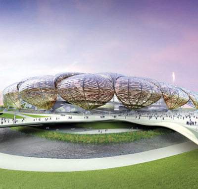 昨年末に発表されたメイン・スタジアムのデザインは、そんな人々の批判をかわすような巧みなコンセプトから成り立っている。「サステイナブル(持続可能)」をキーワードに、計8万人を収容するスタジアムのうち固定席はわずか2万5000席だけで、開催後に取り外される可動席は5万5000席にも及ぶ。すなわち、大幅に規模を縮小できる仕組みだ。建設資材の省エネルギー化も考慮され、軽い部材を組み立てて建設するというイメージ戦略は、テレビのコマーシャルにも頻繁に登場している。テンポラリーな仮設構造なら、理論的には建設費用も低く抑えられているはずだ。