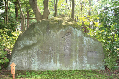東京都清澄庭園にある「古池や蛙飛びこむ水の音」の句碑