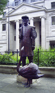 さらに近くには、「バージ・マスター & スワン・マーカー」と白鳥の像が。これもワイン商ギルドと関係があります。バージ・マスター & スワン・マーカーとは、艀(はしけ)の船長服を着た「スワン・アッピング」の責任者のこと。この、12世紀から続く、7月第3週に行われる王室の伝統行事、今ではテムズ河の白鳥の生態調査となっていますが、元来は白鳥を陸揚げして嘴(くちばし)の刻印からその所有権を確認するためのものでした。このイベントで白鳥を捕まえるお手伝いをしているのが、シティの2つのギルド、ワイン商ギルドと染物商ギルドなのです。