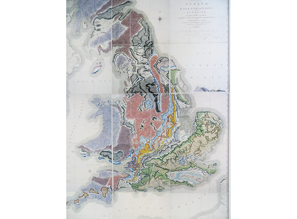 その少し前、地質学会では大変なことが起きていました。当時の英国は産業革命が進展して炭田開発や石炭運搬のための運河開発が盛んでした。地質学が英国で発展したのも、地下資源を効率的に採掘・配分するために地層の研究が進んだからです。そんなとき、運河の測量技師ウィリアム・スミスが登場。彼は深い地層ほど古く、同じ地層には同じ化石が発掘されるという「地層同定の法則」を発見、英国全土の地質図を完成させました。