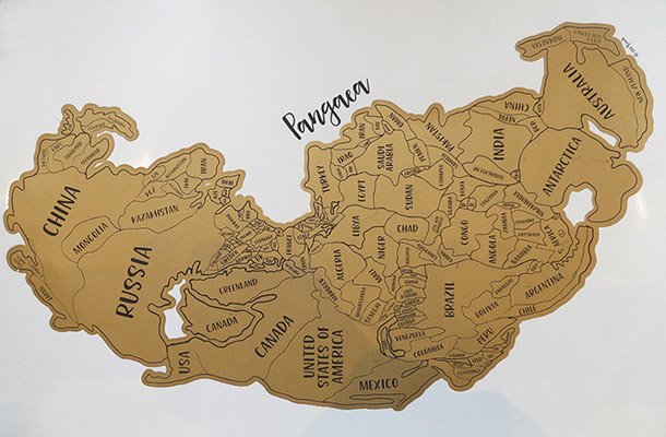 最後はパンゲア大陸について。地図には南米大陸の東側とアフリカ大陸の西側が元々一つの大陸だったことが暗示されています。1912年にドイツの地球物理学者アルフレート・ヴェーゲナーが提唱したパンゲア大陸を、この地図は350年以上前に予見していました。現在では、2億年前まで統合されていたパンゲア大陸が分裂と統合を繰り返し現在の地形になったのが通説。さまざまな国が地球という舞台の上で歴史劇の役割を演じています。