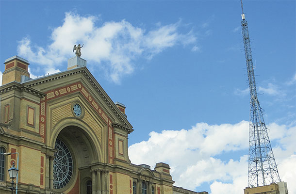 そう、アレクサンドラ・パレスは定期的なテレビ中継の電波塔が世界で初めて建てられた場所。1930年代当時、海抜600フィート(約180メートル)の高さがあればテレビ電波をロンドン全域に送ることができると言われていました。ロンドンには海抜の低い平野部が広がっていますので、都市部に近くなだらかな丘のある場所が電波塔設置の条件になりました。選考に残ったのがハムステッド・ヒースとアレクサンドラ・パレスのあるマズウェル・ヒル。