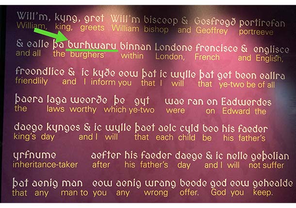 今、シティのギルドホール・アート・ギャラリーではウィリアム征服王がシティに対して発した勅許状が公開されています(2023年1月19日まで)。勅許の内容は、シティがサクソン時代から有する集団の権利と財産権の継続を認めるというもの。この王は裕福なシティと戦うよりも懐柔策を選んだものと解されます。仏語ではなく古英語で書き、シティの住人をBurhwaru(=とりでの住人)と呼んだのも宥和の気持ちが前面に出たからでしょう。ただし、過酷な納税がその前提になっていることを書かないのは仏面鬼心ですね。
