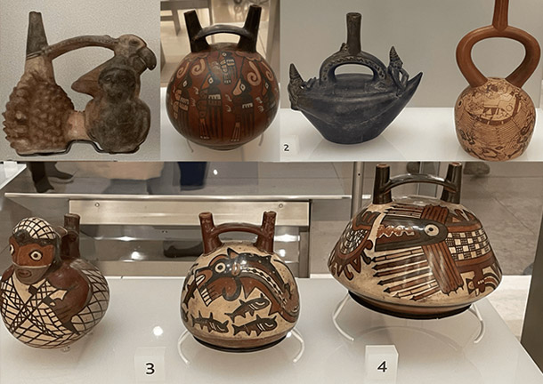 展示されている生活用品には自然界の草花や動物、魚類をモチーフにしたものが多く、特に紀元前千年から紀元後千年に使われた鐙型土器が有名です。それは祭礼儀式に飲まれたチチャと呼ばれるトウモロコシの発酵酒を入れる容器で、注ぐと独特な笛のような音が出て、お酒と音を神様に捧げます。また、自然薬としてコカの葉を多く服用していることでも有名です。どんなに生活環境が厳しく医薬品がなくても、自然を敬い、自然と同化して生きるところに長寿の秘訣があるのかもしれません。