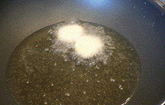 170度に温めた植物油で、軽く揚げ色が付くまで揚げる。網に載せて油を切ったら、キッチン・ペーパーに取り、さらに油を切る。