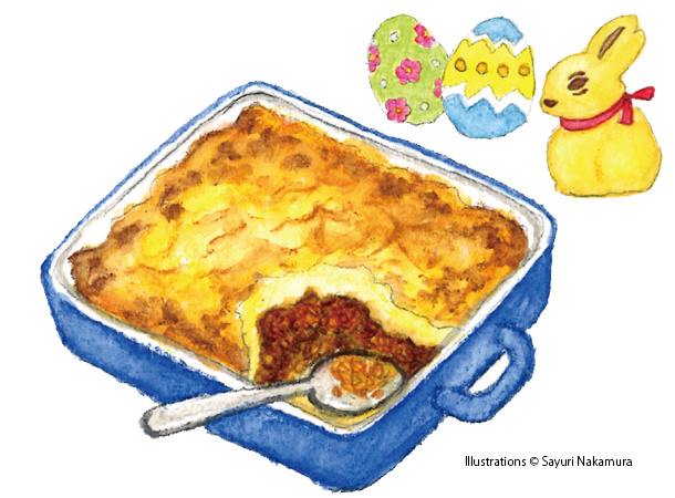 シェパーズ・パイとは、ラムのひき肉にみじん切りの玉ねぎや人参を炒めて混ぜ、ストックやハーブなどを加えて煮込んだのを、上からマッシュ・ポテトでふたをしたもの。それを表面にこんがり焼き色が付くまでオーブンで調理します。熱いうちに「はふはふ」言いながら食べたい、お腹も心もほっこりする料理です。