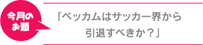 来日する度に「ベッカム様フィーバー」なるものを巻き起こすほど、日本国内では絶大な人気を博してきたベッカム。そんな彼の将来について熱い意見が飛び交うことを期待しての今回のお題だったが、街頭調査では回答に窮する人が多かった。ちょっと意外だったのが「へえ、米国行ったんだ」といった無関心層が見受けられたこと。やっぱりベッカムは落ち目なのか、彼の全盛期は既に過ぎたとの認識もかなりあった。しかし多くの人が彼のルックスなり、ファッション・センスといった彼のタレント性は高く評価している。では引退すべきなのか、と聞くと「サッカー選手であり続けて欲しい」とか「衰えたといってもやっぱり彼は上手い」という意見がアンケートでは多数派を占めた。ちなみに「しゃべりができないからタレントは無理」という厳しいご意見も。いやはや、ベッカム選手の未来はいかに。
