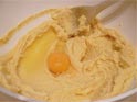 ボウルに常温に戻したバター、又はマーガリンと砂糖(生地用)を入れてよく混ぜる。その後、卵を1個ずつ加えて、その都度混ぜる。