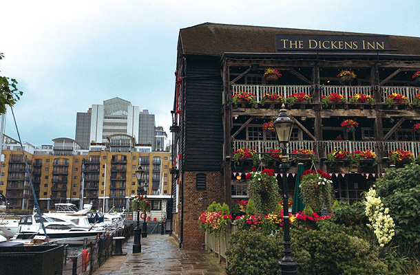 約40年前に文豪チャールズ・ディケンズのひ孫がオープン。入口テラス席からはヨットの並ぶ波止場が見渡せ、2階がピッツェリア、3階はグリルになっている。3階でじっくり焼かれたジューシーなビーフ・パテが絶品の「アルティメット・バーガー」は、人気メニュー。コクと強い味が自慢のご当地エール「ロンドン・プライド」との相性も抜群だ。