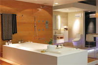 デザイン性が高くハイクオリティーなバスタブやトイレ、洗面コーナーなどを展示するショールーム。LED照明を柔らかく透過するエポキシ樹脂製のバスタブや、渦巻き水流を出すマッサージ効果の高いシャワーなど、斬新なアイデアに溢れた商品を展示している。ビジネスのお客様のみならず、アポ無しの個人客が訪れるのも大歓迎とのことなので、あれこれ見て触ったりしながら家の未来図を描こう。
