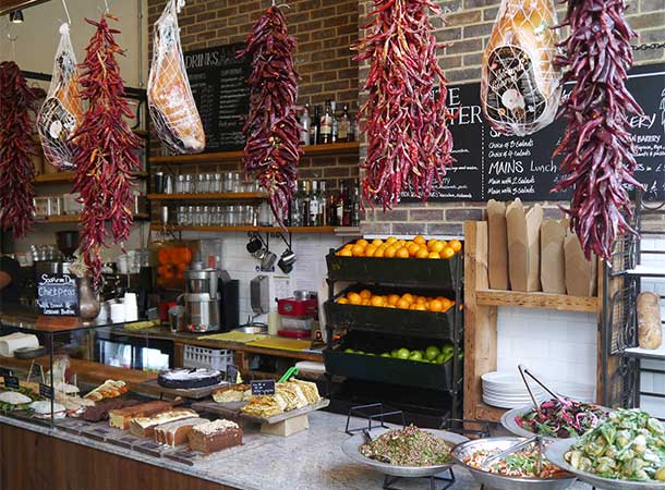 唐辛子の束や生ハムが天井から何本も釣り下がる、インパクトのあるインテリアのカフェ & レストラン。ランチやディナー時には、調理されたばかりの地中海風サラダやオーブン料理がカウンターに次々に並べられる。そのほとんどはベジタリアン仕様。ヘルシーなだけでなく、食欲をそそるカラフルな色合いが目にもうれしい。レモンを利かせた生魚料理セビーチェなどもあり、日本人の口にも合いそうだ。
