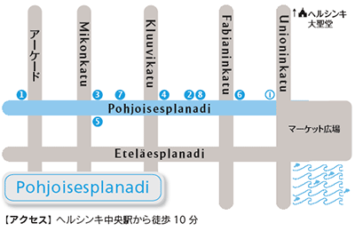ストップオーバーで立ち寄るだけでも、たとえ雨に降られてしまった場合でも、十分に楽しむことができるのがお買い物。そこでフィンランドならではのブランド・ショップが並んだ、市内中心部からフェリー乗り場までをつなぐポホヨイエスプラナーディ通りのお店をご紹介!